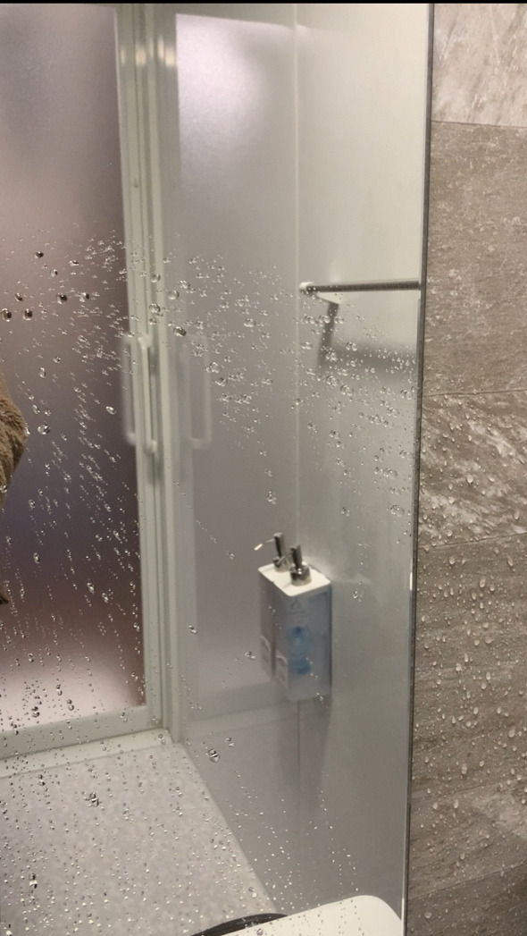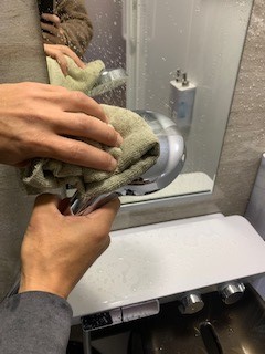 お風呂の鏡ってボディーソープやシャンプーが飛び散って、曇ってしまったり・・・アルカリ電解水らくらくで掃除した後、水をかけるとベタっとしています。